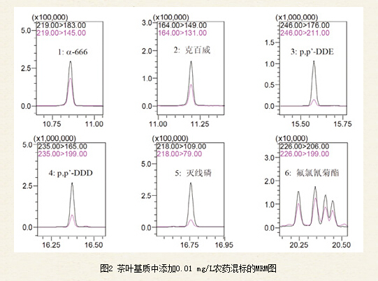 技術(shù)分析茶葉中多種農(nóng)藥殘留,GPC-GCMS可以減少茶葉基質(zhì)中色素等雜質(zhì)干擾,同時(shí)允許大體積進(jìn)樣;而GC-MS/MS的MRM采集方式克服了GCMS測(cè)定易受到茶葉基質(zhì)干擾的缺點(diǎn)( 圖1、圖2);這兩種測(cè)定方式,都能簡(jiǎn)化樣品的前處理,同時(shí)提高方法的靈敏度。利用二手GCMS-TQ8030三重四極桿氣質(zhì)聯(lián)用
