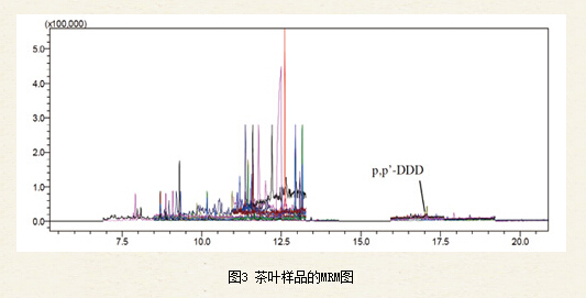 對(duì)茶葉樣品進(jìn)行實(shí)際檢測(cè),其中檢出p,p’-DDD(圖3)。