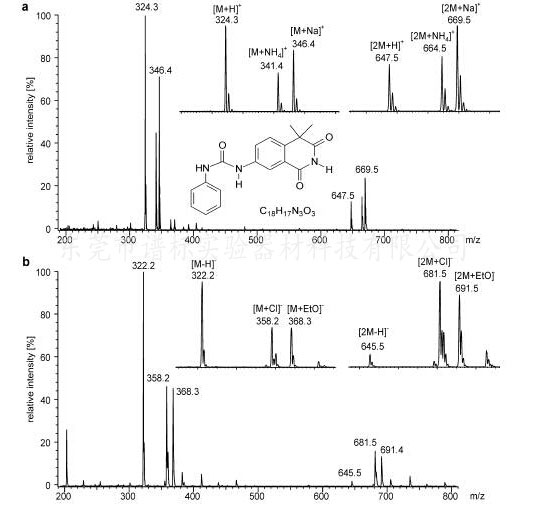 小分子化合物分析一般ESI源和APCI源就已經(jīng)足夠了,ESI源適合于極性大的化合物,如一些氨基酸、多肽、寡聚糖、表面活性劑等,ESI源除了得到[M+H]+外,也容易得到[M+NH4]+、[M+Na]+,還有雙分子離子峰[2M+H]+等;下圖是anti-HIV藥物在含有氯化銨的乙醇溶液的Nano-ESI源的正和負離子譜圖。