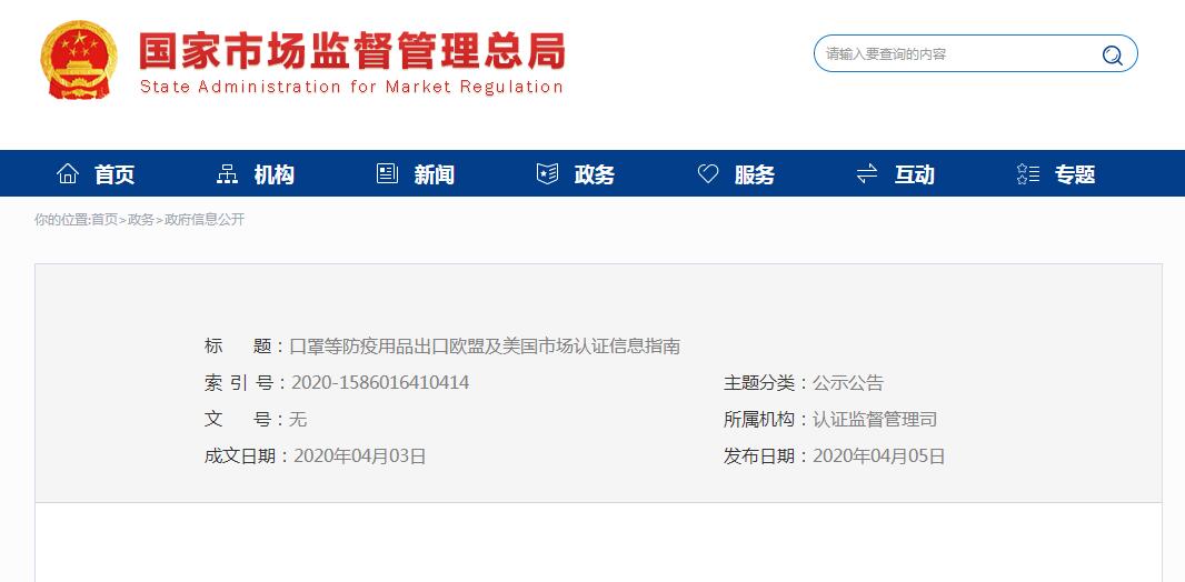 4月5日國家市場監(jiān)督管管理總局網(wǎng)站發(fā)布《口罩等防疫用品出口歐盟及美國市場認證信息指南》。具體內(nèi)容參考如下: