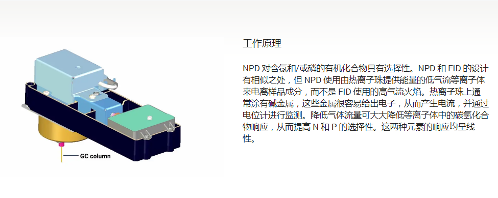 氮磷檢測器(NPD)是氣相色譜檢測器的后起之秀。是電離型檢測器之一,檢測低基流背景下信號電流的增加。NPD對氮磷化合物靈敏度高,專一性好,專用于痕量氮、磷化合物的檢測。已在環(huán)保、醫(yī)藥、臨床、生物化學、法庭科學、染料和食品等領域得到廣泛應用。