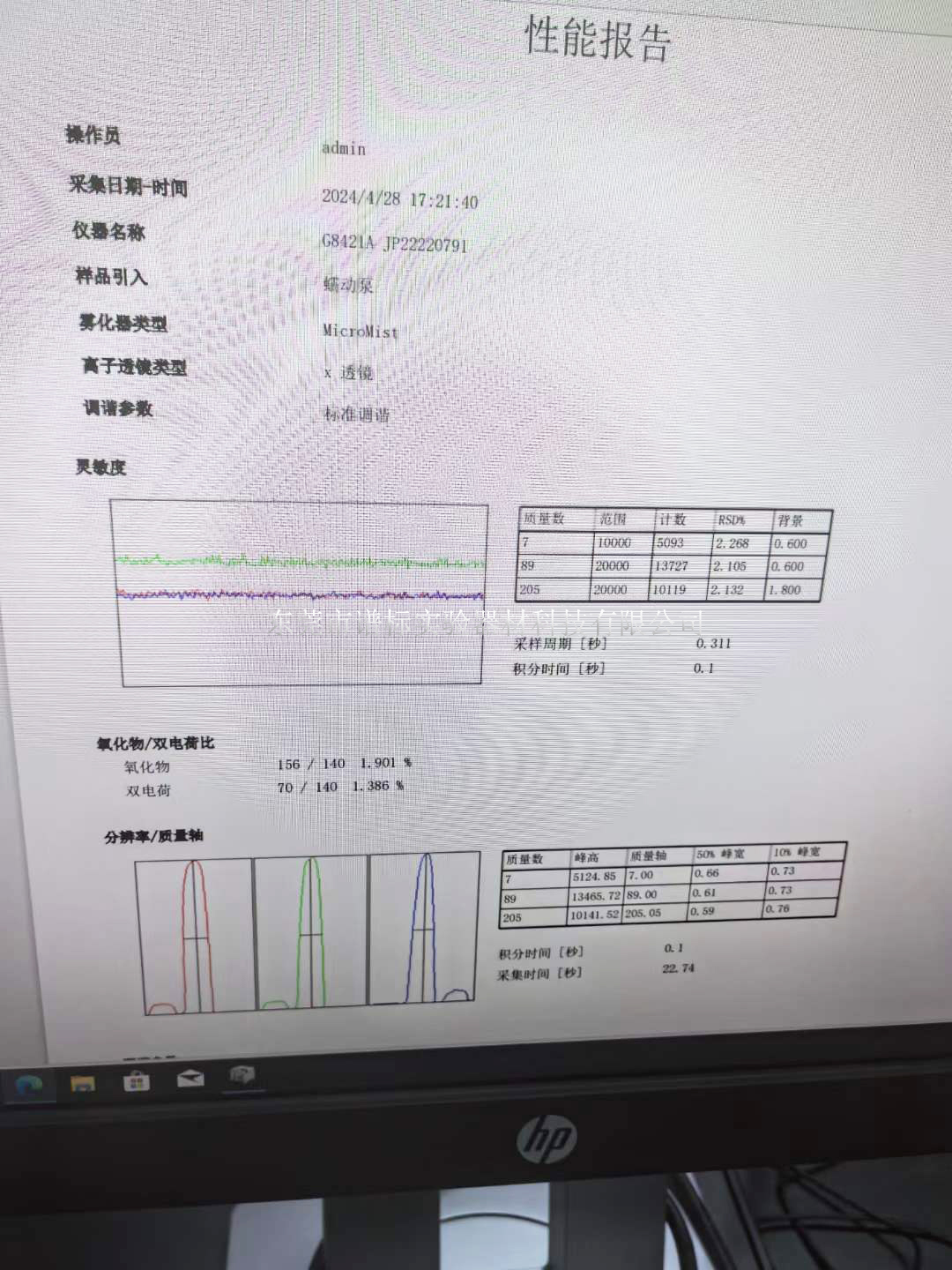 工程師調(diào)諧本臺安捷倫電感耦合等離子體質(zhì)譜儀7800的性能報告靈敏度,分辨率數(shù)據(jù)如上,快速的設(shè)置和簡化的分析,從而節(jié)省了時間,能使您的實驗室輕松獲得出色的結(jié)果