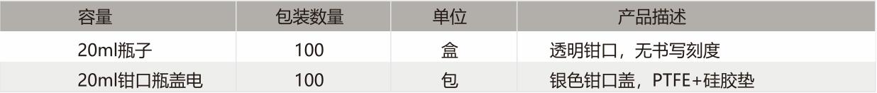 材質(zhì):瓶子(玻璃); 墊片(PTFE/膠) ; 蓋子(鋁蓋)